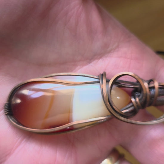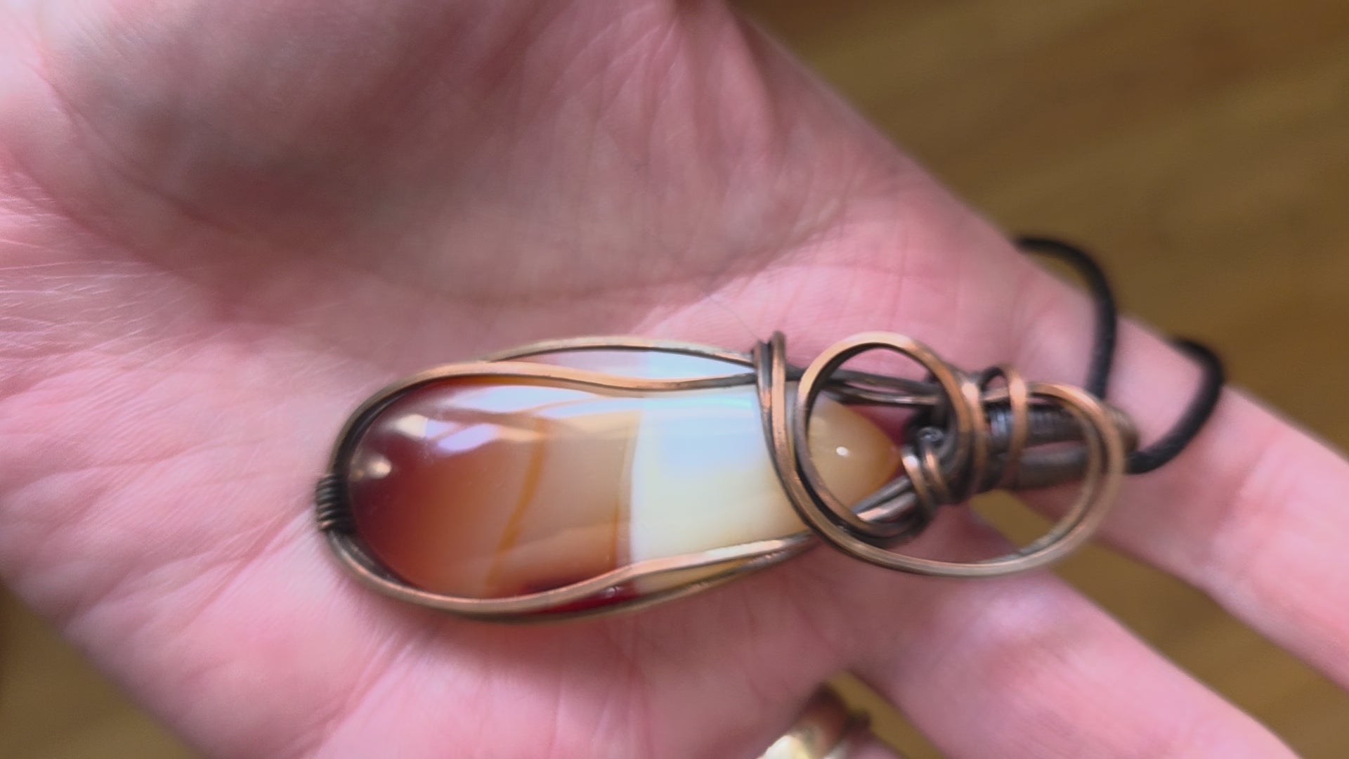 Carnelian wrapped in aged copper. Comes on a black cord.