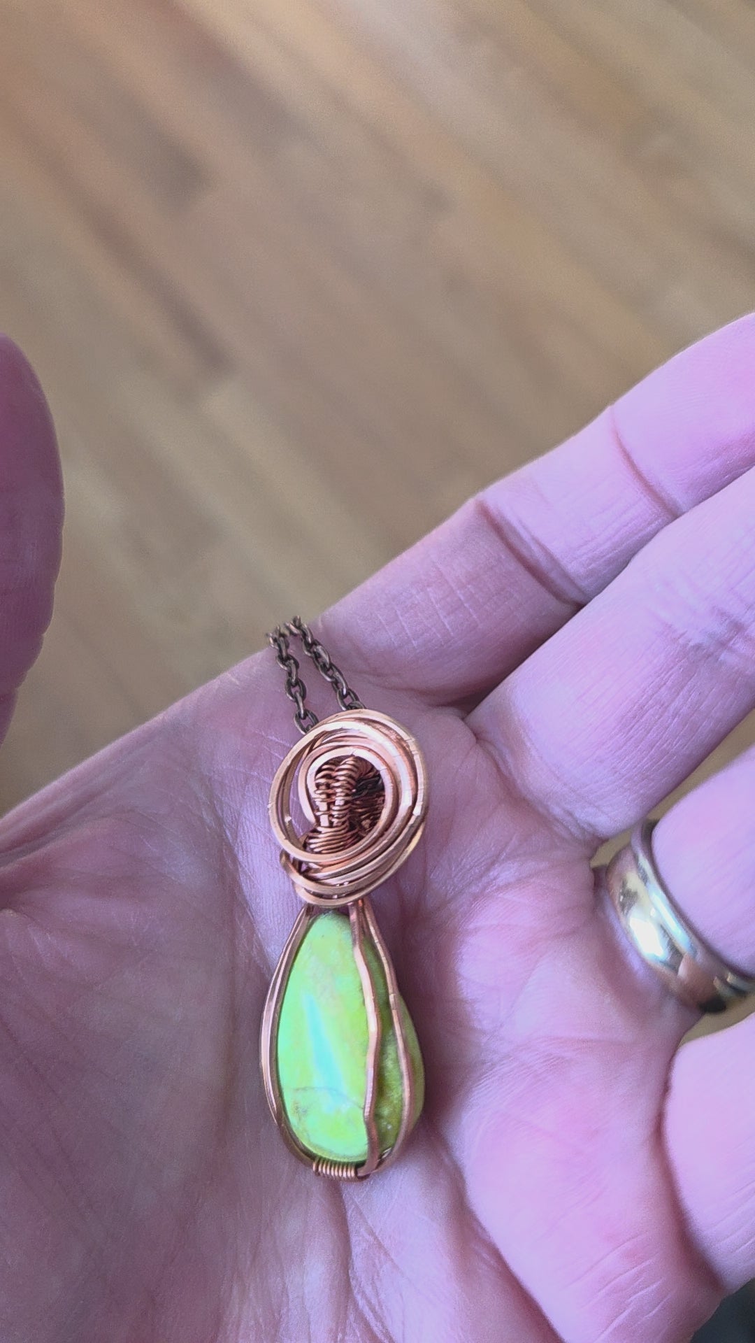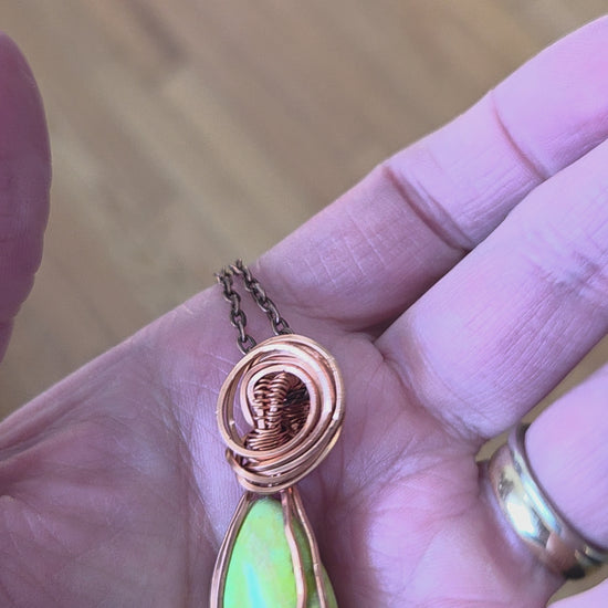 Gaspeite wrapped in aged copper. Comes on a starter copper chain.